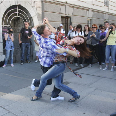 Tudi letos bo v Ljubljani posebna plesna fešta pod taktirko plesalca in koreografa Gorana Bogdanovskega, gledališča Ane Monroe, Fičo Baleta in Nomad Dance Academy, ki se je že lani zelo dobro obnesla, in dogajanje v centru prestolnice je bilo prava paša za oči. Go Out&Dance se torej nadaljuje. Moto Go Out&Dance! naj vas prepriča, da besede tudi udejanite; na fotografiji plešoča brat in sestra Špela in Matej Kralj na lanskem praznovanju dneva plesa."V letu 2010 je Gledališče Ane Monroe, prav z zadnjo v vrsti, spomladansko Prešerno Ano, zaključilo svoj Letni krog delovanja. V sodelovanju z Nomad Dance Academy in številnimi plesnimi ustanovami, društvi in zavodi ter svobodnimi umetniki, ki v ospredje svojega izražanja postavljajo gib, se je aprila lani plesalo po vsem središču Ljubljane. Umetniški gib in družabna scena sta na ulici korakala z roko v roki, odziv občinstva je bil odličen in v letu 2011 tako le nadaljujemo dobro začrtano zgodbo: s starimi in nekaterimi novimi soustvarjalci, na že znanih lokacijah in za ovinkom, kjer plesnih korakov niste pričakovali – ne le v središču Ljubljane, na svetovni dan plesa, 29. aprila, se bo plesalo tudi na Živih dvoriščih Maribora ter na ulicah in trgih Nove Gorice," sporočajo organizatorji. Natančen program pa si oglejte na http://www.anamonro.org/index.php?option=com_content&task=blogsection&id=13&Itemid=173 Lani se je treslo Tromostovje pod taktirko norveške koreografinje Camile Trefelsen, ki je narekovala korake za eurosongovski Flesh Mob. (Foto:Bojan Okorn)