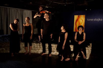Zato smo Živine učenke Jasna Knez, Neja Kos, Silva Ros in jaz, ki smo na svoj način še povezane s plesno sceno, stopile skupaj in iskale motive za zaključno plesno instalacijo ob zaprtju Stojkove razstave. Silvi Ros se je porodila ideja! Galerijo Jakopič, ki je postavljena pod nivojem Slovenske ceste, je zaznala kot prostor Tonetovega hobija, podvodnega snemanja. Dramaturško je osmislila dogajanje v sceni Galerije in tako zaključni performans poimenovala po pesmi Janeza Bitenca Na dnu morja steklen je grad. Plesna instalacija v prostranosti Galerije je klicala po glasbeni liriki, zato je Silva povabila gimnazijko Kajo Šoštarič, ki se je malo pred tem izkazala na zaključnem koncertu svojega desetletnega šolanja na glasbilu violine. Mlada Kaja je instalacijo plesa in glasbe v likovnem Galerijskem prostoru začela s tihim petjem prve kitice Bitenčeve pesmi, potem pa je v glasbeni liriki violinskih strun in v prepletu kratkih glasbenih motivov spodbujala gibalne skice in ples nastopajočih. Predstave ne bi bilo brez Jasne Knez.