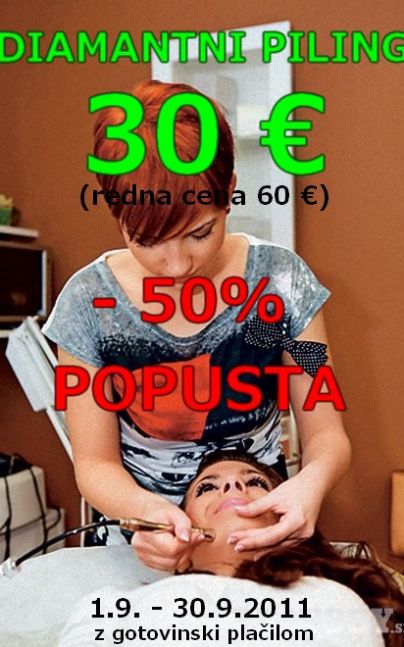 Nov način regeneracije in čiščenja kože. Mikrodermabrazija je postopek kjer postopoma in kontrolirano luščimo povrhnjico. Diamantni piling deluje na osnovi diamantnih konic. Kombinira glajenje povrhnjice kože z lasersko obdelanimi diamantnimi konicami in vakuma.