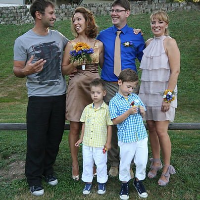 Saša in mož Iztok s poročnima pričama in otrokoma.