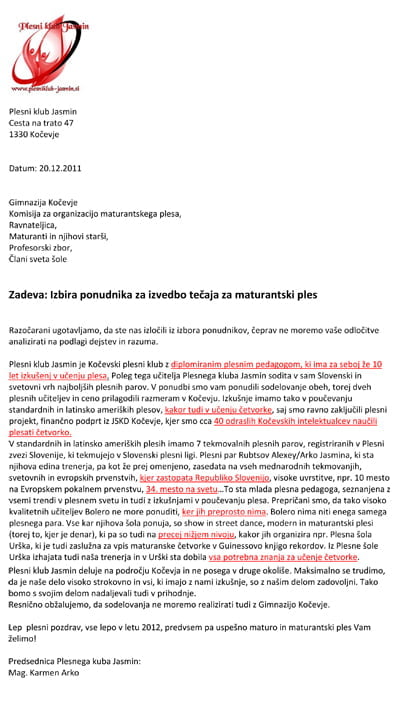 1. Demanti: Plesni klub Jasmin je že lansko šolsko leto kandidiral za ponudbo za učenje maturantov, natanko tako, kakor sem napisala. V konkurenci sta bila še Plesna šola Urška in Bolero. Pojasnilo, ki smo ga dobili, zakaj nismo izbrani, je bilo, da nismo podali celovite ponudbe, torej tudi maturantskega plesa. To vendar vedo vsi lanskoletni maturanti, učitelji in starši …