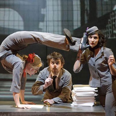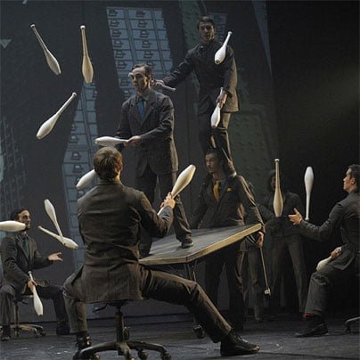 Na velikem odru Gallusove dvorane se je tako v petinosemdesetih minutah slikovito izpisal aktualni realizem birokratskega kopiranja, tiskanja in prekladanja ogromnih kupov nepregledanega ter neuporabnega papirja, ki je ob duhovitih domislicah in artističnih atrakcijah tudi žanrsko zabaval. Sivina obremenjuje in ima svojo težo, v predstavi pa se ponazarja v pestrem koreografskem prepletu artističnih akrobacij in gibalnih moči fizičnega gledališča, izvajalci – plesalci pa odlični, in za povrh v svojih izvedbah presegajo meje zmožnega ter že videnega. Ena teh artistk se je zvijala na mizi, kot da bi bila iz gume, druga na drogu in v zraku; nekoč so jih imenovali človek – kača, danes pa jih prepoznamo kot artiste kontorzije. Iluzijo vrtečega se planetarnega sistema ob neverjetnih ravnotežnih dognanjih je ilustrirala skupina artistov, ki so se vrteli na kroglah in valjih eden nad drugim in vsak v svojo smer, pa ne le vrteli, ampak se tudi elegantno izpostavljali v akrobatskih pozah. …