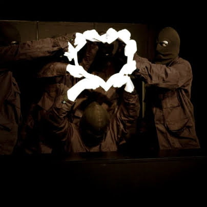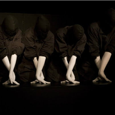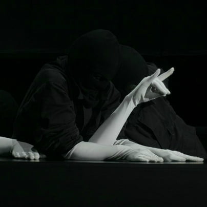 Poleg omenjen mize, ki se je v domiselni delovno gibalni koreografiji in po potrebi postavljala pred gledalce, je sceno krasila še črna plahta z opaznimi zarezami. Kot v grozljivki so iz zarez začeli drseti prsti pa bele dlani, nato še roke, vrhunec groze pa nastopi, ko se spusti okno črne plahte in ogromna silhueta v bojni črni opremi ter zamaskirana s črno masko (debelo pleteno) stopi v črno temo in se nameri proti gledalcem … in tako posamično vseh pet. Zavladala je tišina, po tiho pa neka mamica pripomnila, da bi se njen sinko prestrašil, po dvorani se je isti trenutek razlegel otroški smeh, saj so črne silhuete noči prav take kot tiste, ki jim otroci sledijo v svojih računalniških igricah in TV-risankah. … (Foto: Przemek Sieraczynski)
