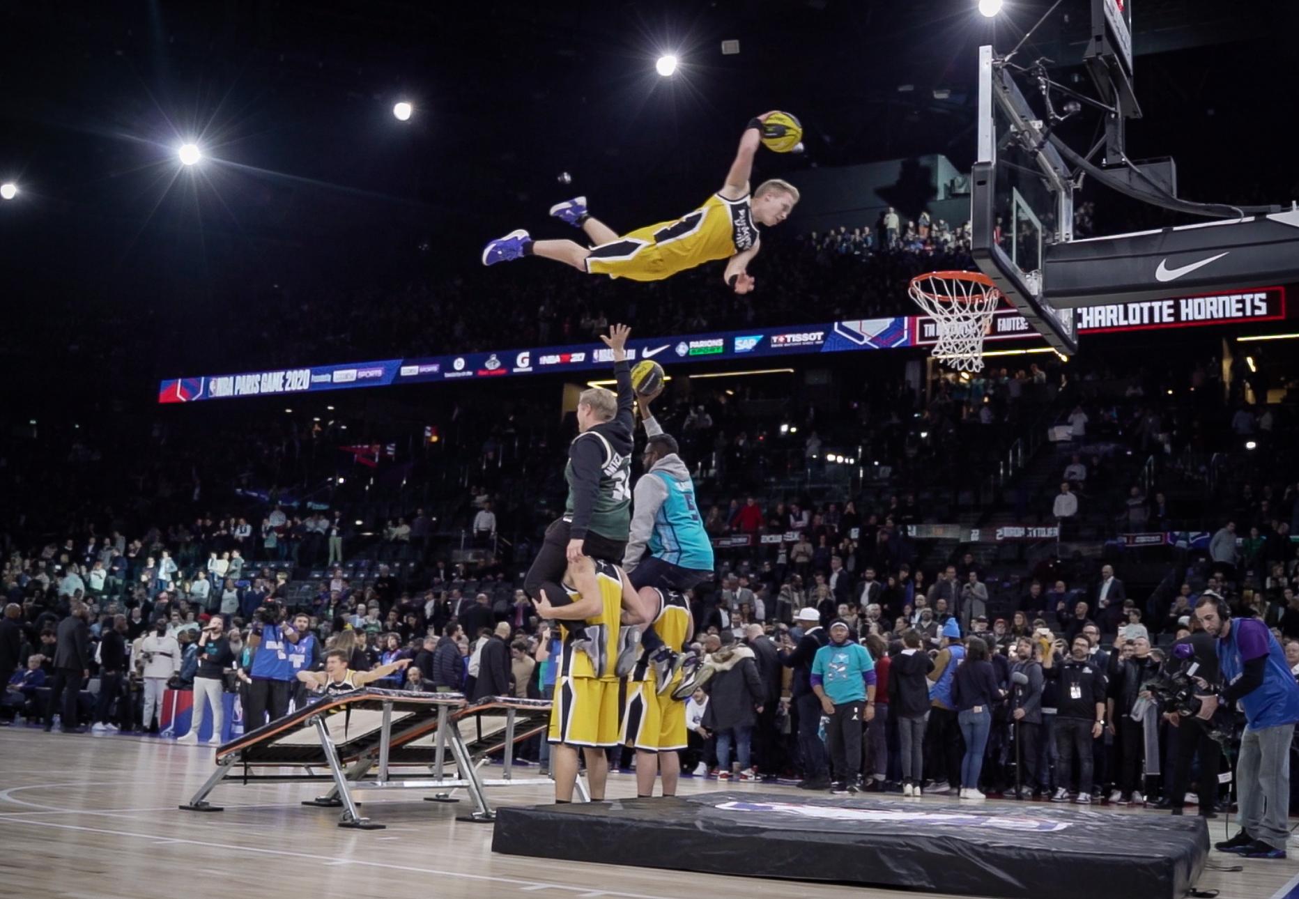 Svetovno znani akrobati Dunking Devils se že dolgo uvrščajo v sam vrh športno-zabavne industrije. V svoji desetletni karieri so leteči vragi navdušili množice že na več kot 2,000 prireditvah, tokrat pa so za vrhunsko doživetje poskrbeli na tekmi lige NBA v Parizu. V štirih dneh so Dunking Devils z brezhibnimi nastopi osupnili obiskovalce v coni za obiskovalce in VIP hiši NBA, organizatorji pa so jim zaupali tudi animacijo na razprodani tekmi med kluboma The Milwaukee Bucks in The Charlotte Hornets. Akrobati so večtisočglavo množico zabavali pred tekmo in med polčasom, s svojimi vragolijami pa so očarali svetovne športne zvezde, med njimi tudi NBA košarkarja Michaela Jordana in brazilskega nogometaša Neymarja, ki od njih kar ni mogel odtrgati oči.