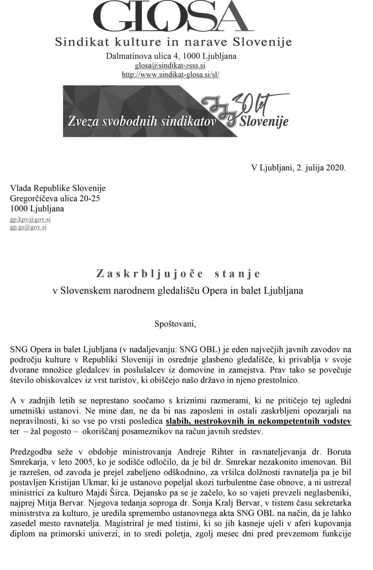 Težava vodstev, tako trenutnega kot prejšnjih, izhaja predvsem iz dejstva, da nihče, prav zares nihče od ravnateljevanja dr. Boruta Smrekarja dalje ne pozna ne ustroja ne delovanja tako kompleksne hiše, kot je SNG Opera in balet Ljubljana. Zadnji, ki je o tem kaj vedel, je bil Kristijan Ukmar, ki je nasledil Smrekarja, vendar ga je Majda Širca, takratna ministrica za kulturo, odstavila in zamenjala z Mitjo Bervarjem, ki ni imel po mojem mnenju niti znanja niti vodstvenih sposobnosti za vodenje takšne hiše. Z njim in nadaljnjimi ravnatelji smo prišli v neko stanje, kjer sploh ni bilo potrebe, da ravnatelji poznajo operno in baletno hišo, glavno, da so jih opisovali kot neke krizne managerje, ki bodo situacijo uredili. In tako se je iz dneva v dan kriza poglabljala. Zdaj se je pokazalo to, na kar smo v sindikatu opozarjali že vsa leta. V času debelih krav in neprestanega dotoka dodatnega denarja lahko vodi Opero vsak. Ko pa pride do krize, kot je zadnja covid-19, pride do izraza poznavanje delovanja, ki se kaže v agilnosti upravljanja, proaktivnem delovanju ter prepoznavanju priložnosti. Če k temu dodamo še kontradiktorne informacije, ki so jih določeni zaposleni prejemali, nerazumne odločitve, utemeljene s pristojnostjo umetniškega vodenja, in povsem nerazumno zapostavljanje umetniškega kadra, za katerega vemo, da potrebuje redne vaje za ohranjanje umetniške kondicije, potem dobimo razlog za nezaupanje zaposlenih vodstvu. Dopis sam je bil naslovljen na Vlado republike Slovenije. Kolikor vem, je bil posredovan na ministrstvo za kulturo, kjer se naj bi se zgodil tudi že sestanek z Ravterjem. V sindikatu Glosa pričakujemo odločno ukrepanje ministrstva, ki bi ga morala trenutna situacija gotovo skrbeti. Pričakujemo, da se bo ministrstvo potrudilo in našlo vodstvo, ki bo sposobno in pripravljeno popeljati SNG Opero in balet Ljubljana v boljše čase.