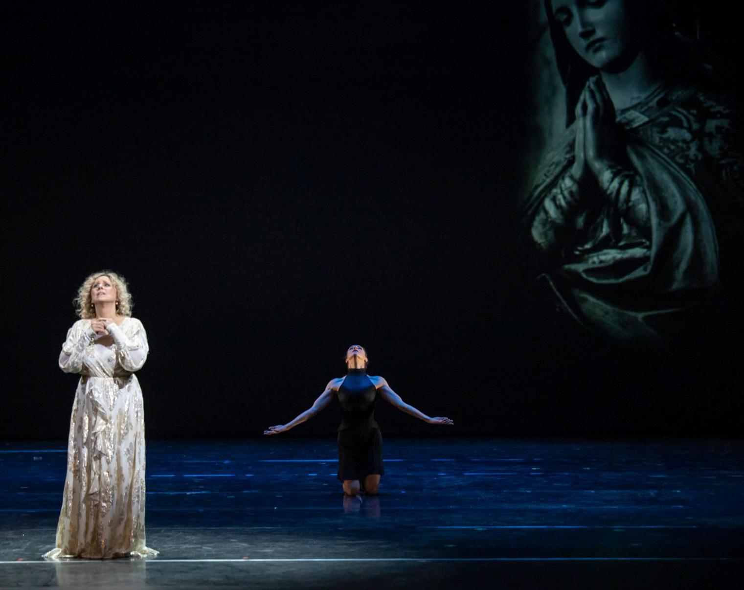 Glasbeno sceno je obsijala še ena glasbena molitev Ave Maria, skladba argentinskega skladatelja in harmonikarja Astora Piazzolle ob zanimivi celostni podobi bosonoge mezzosopranistke Nuške Drašček Rojko ter klavirski spremljavi Irine Milivojević, ko v kontrast čutnemu izlivu ženske molitve nastopi tercet baletnih solistov, pravzaprav se povzdigne z odrskih tal: Rita Pollacchi, Tjaša Kmetec, Kenta Yamamoto. Tercet se medsebojno prepleta, tudi dviguje v duetih, praktično živo med seboj komunicira v klasični baletni kompoziciji, žal pa tudi prevečkrat prekrije lik operne solistke, ne glede na to, ali poje ali pač miruje. Le pravo pozicijsko postavitev bi morala imeti solistka, da bi bila njena interpretacija vseskozi v vidnem polju. Tudi tu se snemalna ekipa poigra s plesnim tercetom, ko ga vizualno senči in povečuje ter preliva čez sceno ob novodobnih tehnoloških popestritvah.