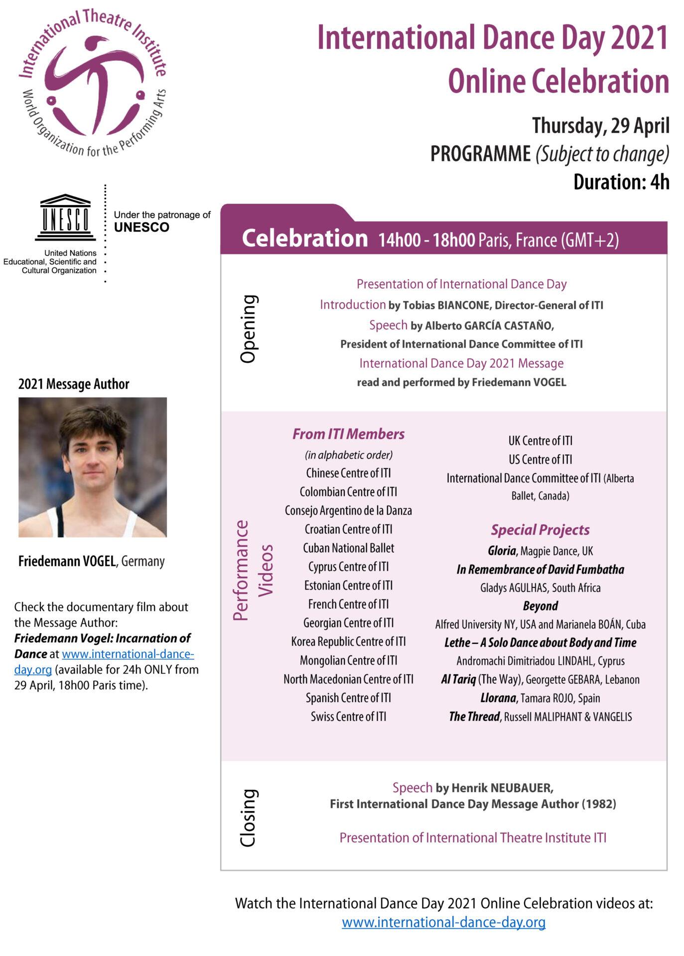 Letošnji svečani pišoči plesalec, ki svetu sporoča svojo poslanico, pa je baletnih stuttgartskega baleta Friedemann Vogel, ki v prevodu dr. Neubauerja pravi takole: “Vse se začne z gibanjem – nagonom, ki ga imamo vsi – in ples je gibanje, oplemeniteno za sporazumevanje. Čeprav je brezhibna tehnika pomembna in prepričljiva, je nazadnje bistveno tisto, kar plesalec izraža v okviru gibanja. Kot plesalci smo nenehno v gibanju in skušamo ustvariti te nepozabne trenutke. Vsak plesalec si ne glede na plesno zvrst prizadeva doseči to. Ko torej naenkrat ne smemo več nastopati, ko so gledališča zaprta in festivali odpovedani, se naši svetovi ustavijo. Ni fizičnega stika. Ni predstav. Ni občinstva. Plesna skupnost še nikoli v novejši zgodovini ni bila tako kolektivno izzvana, da ostane motivirana in najde svoj razlog, da obstaja. A prav takrat, ko nam je odvzeto nekaj dragocenega, resnično cenimo, kako pomembno je tisto, kar počnemo, in koliko ples pomeni družbi na splošno. Plesalce pogosto častijo zaradi njihovih fizičnih zmožnosti, dejansko pa nas še bolj krepi naša duševna moč. Verjamem, da nam bo ta edinstvena kombinacija telesne in psihološke spretnosti pomagala premagati vse in se spet postaviti na noge, da bomo še naprej plesali in še naprej navdihovali.”