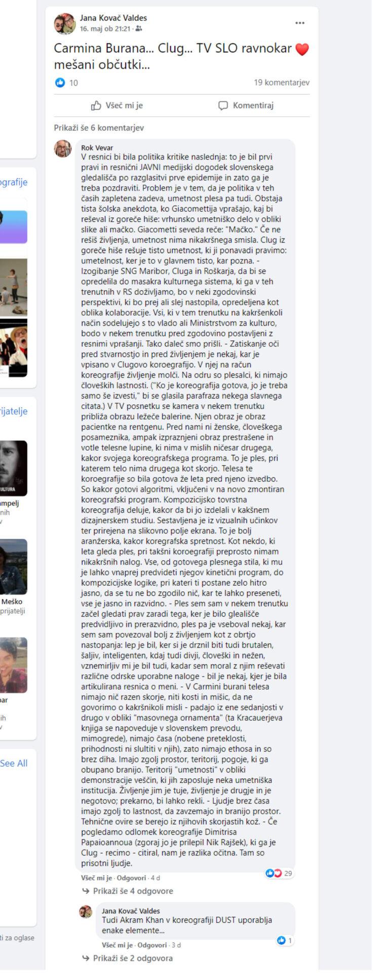 Poudarek seveda na večina, saj se je na družbenem omrežju na Facebook pod zapis oz. post (Carmina Burana … Clug … TV SLO ravnokar … mešani občutki) pedagoginje na Konservatoriju za glasbo in balet Ljubljana Jane Kovač Valdes odzval Rok Vevar, teatrolog, publicist, kritik, in dobesedno ‘pobruhal’ predstavo, Edwarda Cluga in celo ravnatelja mariborskega gledališča Danila Roškerja.