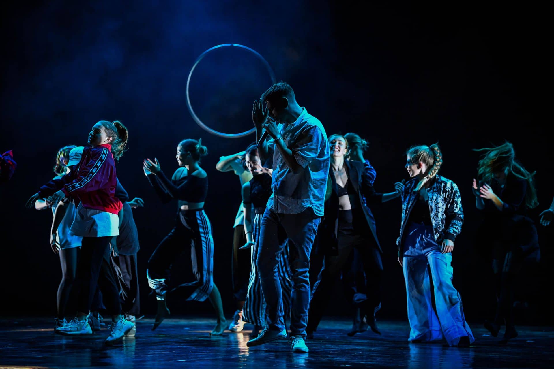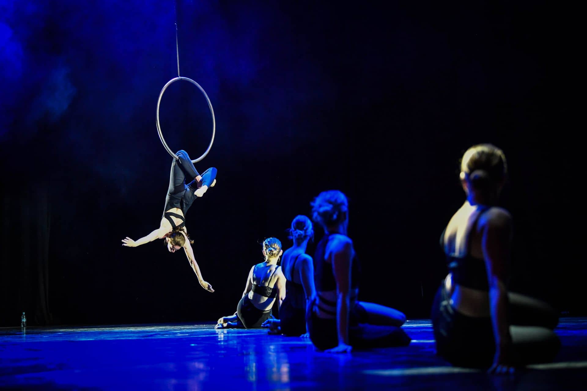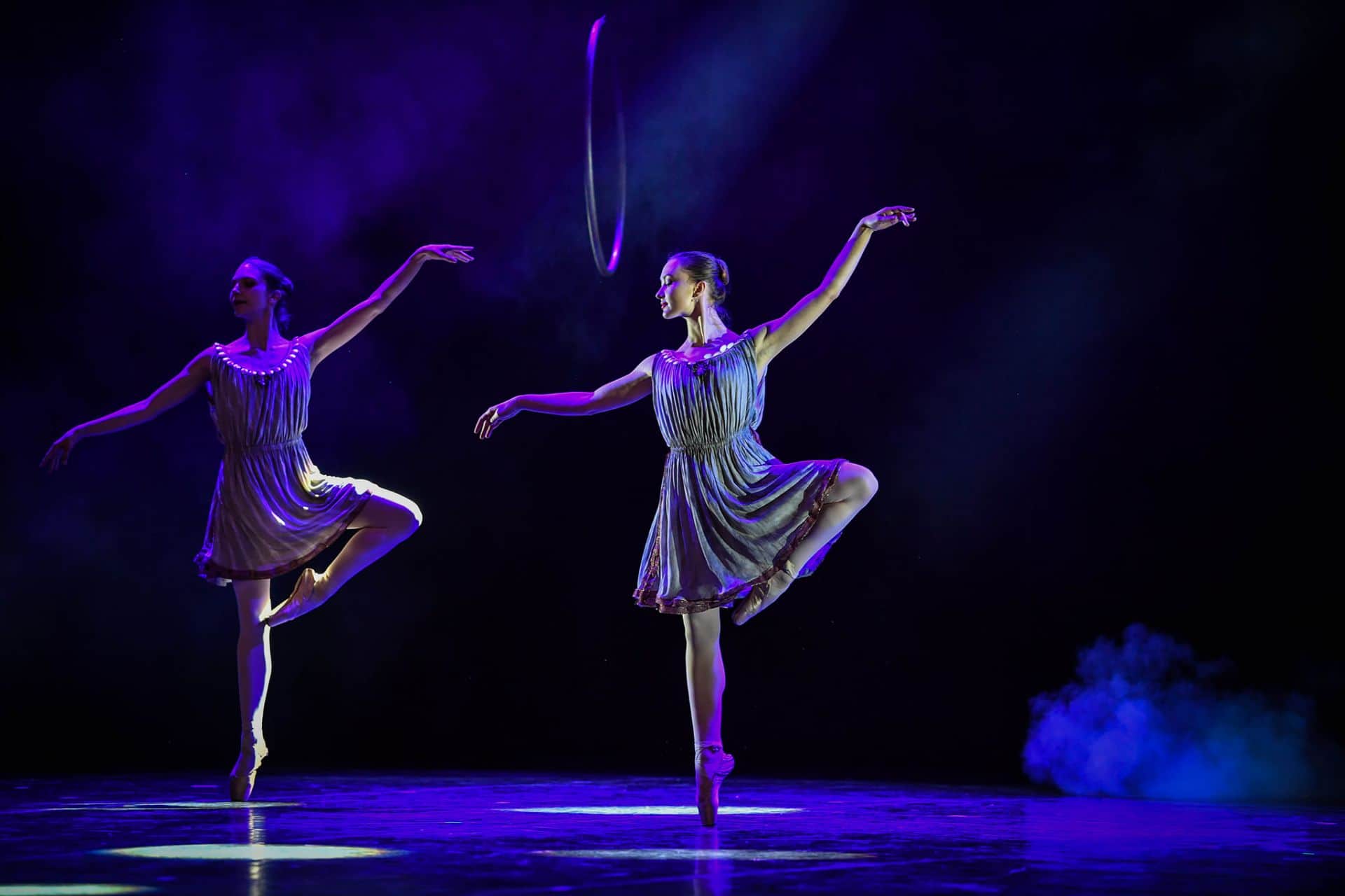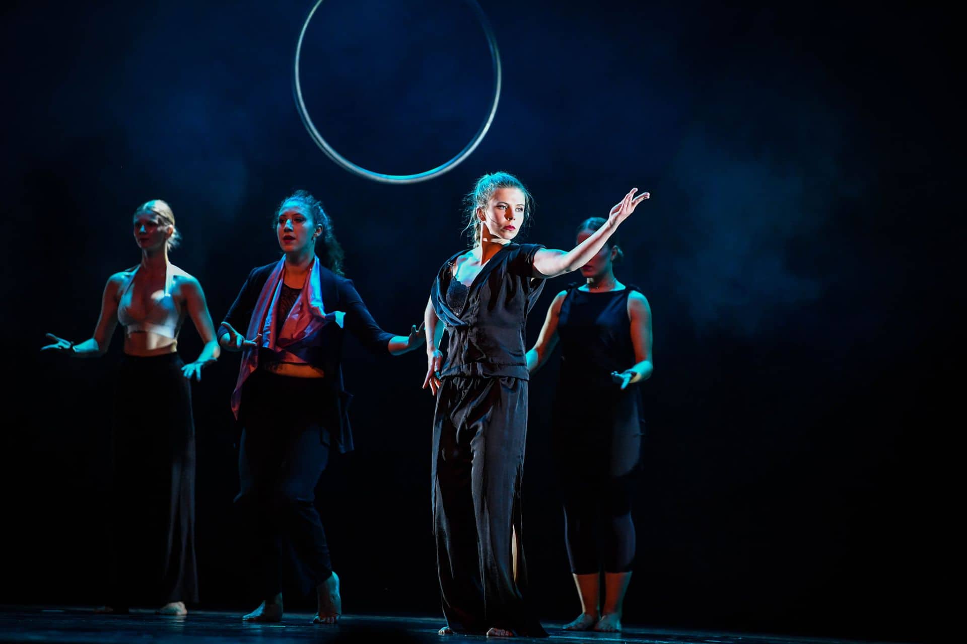 Pod mentorstvom Rosane Hribar se je prvi letnik sodobnega plesa izpostavil še v eni sodobni ustvarjalni kompoziciji, tokrat na glasbo Philipa Glassa. Njihovi dinamični plesni vhodi-izhodi se tudi celovito zaokrožili in združili v osemminutni koreografiji z avtorskim solom Mance Vukelič Zračna disciplina na obroču, absolventke AMEU − Akademije za ples, smer sodobni ples. V ta zanimiv splet dveh koreografskih različic, raziskovalnega plesnega sola na obroču v višavah odra in ob dinamiki skupinske koreografije študentk prvega letnik se v nadaljevanju organsko pridružila še tretja koreografija v sklopu predmeta Sodobne plesne tehnike v izvedbi študentk 2. in 3. letnika pod mentorskim vodstvom Urše Rupnik. Iskrile pa hitrosti, solistični utripi in zahtevne izvedbe skupnega ustvarjanja ter sobivanja v sodobnih gibkih strukturah dvominutnega medsebojnega plesnega povezovanja. Ta osrednji kompozicijski del raziskovanja in smiselnega povezovanja skupinskih ter solističnih plesnih struktur pa se zaključil še z drugim delom plesnega sola Zračna disciplina na obroču avtorice Mance Vukelič. Tudi se zračni solo v drugi polovici nadaljeval tam, kjer se je prvi in bolj lirični utrip njenega sola zaključil. Nadaljeval pa na gibki in zahtevno strukturirani fuziji plesnih in akrobatskih oblik, zajetih v lebdečem obroču višinskih ravnotežij. V tej simpatično kombinirani scenski strukturi je svoj ustvarjalni kotiček pridobil še dvominutni solistični izliv Zarje Ferlinc, avtorski solo jazz plesa, s katerim je uspešno opravila avdicijo na AMEU − Akademiji za sodobni ples, smer jazz ples. Tudi se Daša Resnik predstavila s svojim sodobno strukturiranim avtorskim solom, s katerim je uspešno opravila avdicijo na AMEU − Akademiji za ples, smer sodobni ples.
