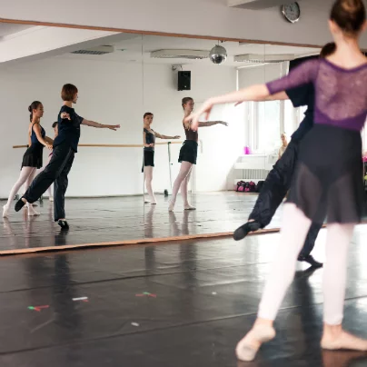 Pedagoginja Maja se je že ob vsaki napaki takoj odzvala, popravki pa tekoče sledili, praktično v istem trenutku za vsako udeleženko. Največkrat so napake nastajale pri osnovni drži, tudi rok, pa postavitvi lopatic, stopal, baletnih pozicij, stabilnosti, ravnotežju, pri obratih … Na moje vprašanje, kako ji je všeč Bled, je Maja Dumčenko odgovorila: "Zelo mi je všeč tu, svoje bivanje sem vzela kot dar poletnih počitnic." "Kaj pa bi rekli o naših baletnih učenkah, ki sledijo vašemu seminarju?""Prvič – prihajajo z različnim predznanjem, tu so od učenk profesionalnih šol do baletnih začetnic, vendar si vse enako prizadevajo, 200-odstotno sledijo, se trudijo in sprejemajo, saj toliko vadbene klasike v enem dnevu nimajo niti naši profesionalci. Cenim, da so prišle sem na lastno željo, in želja je lahko celo pomembnejša od pridnosti. Zavedam se, da jim v tem kratkem času ne morem nuditi veliko, le informacije, na katere naj bi bile pozorne in bi jih tudi lahko s časom in delom usvojile." "Kaj bi jim svetovali?" sem jo še hitro vprašala, kajti odmor se je že bližal koncu. "Predvsem želim reči, da tem dekletom, ki stopajo na to pot ali se zanjo odločajo, nehamo pridigati, da je pot težka, negotova, in ne vem, kaj še vse. Moramo se zavedati, da tisto, kar si otrok želi, zanj nikakor ni težko. In kjer je velika želja, je vedno lahko tudi uspeh. Kot pedagog in iz svojih izkušenj bi rekla, da je naloga vsakega učitelja, da zna s svojim poukom pridobiti in navdušiti učenca, potem pa ob pravilnem delu in veliki želji pride tudi rezultat." In Maja Dumčenko uči z milino izraza, z nasmehom, tudi preprostost in mir kar izžarevata iz nje. … Liza Podjavoršek in Neja Hrastar (v ogledalu) …
