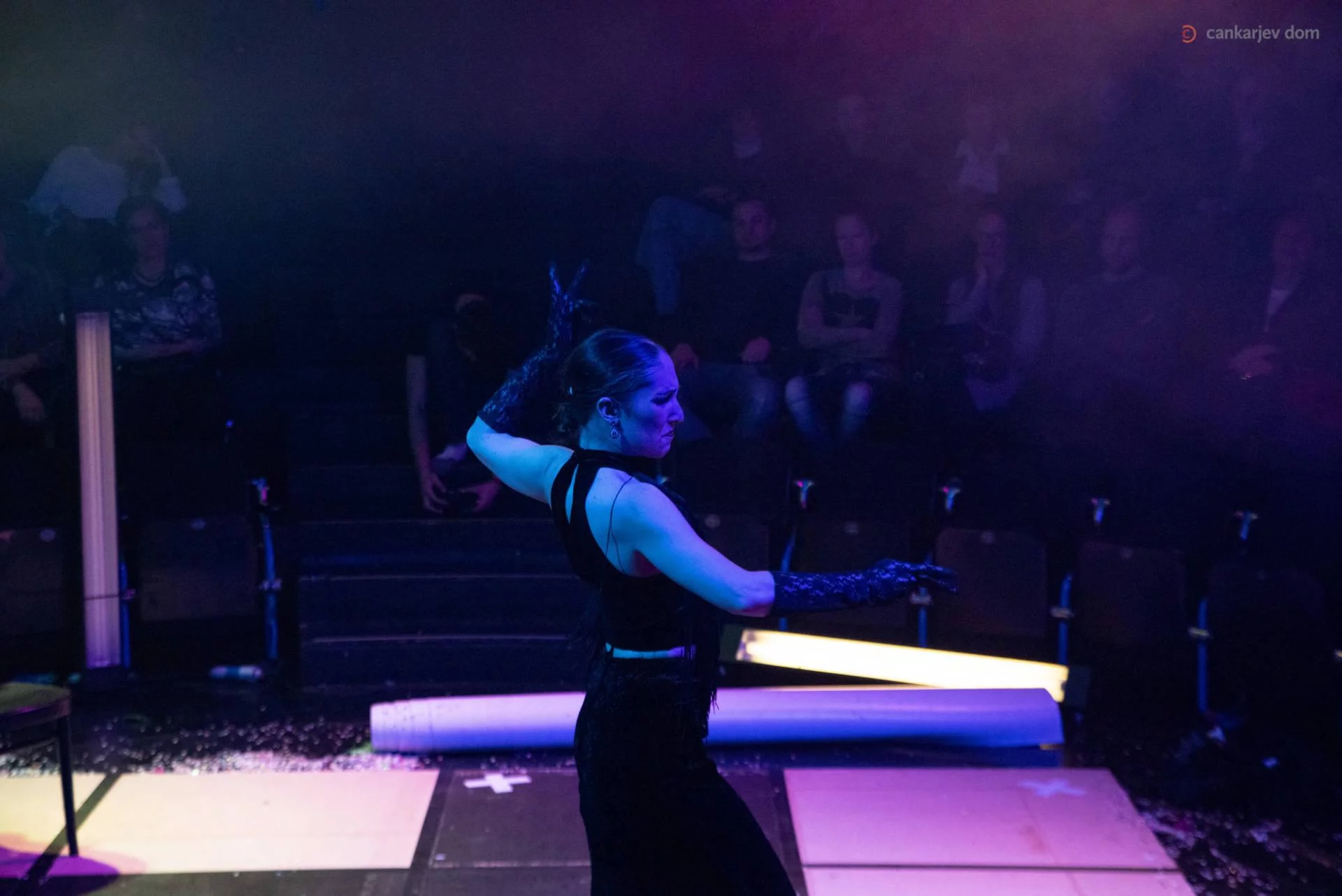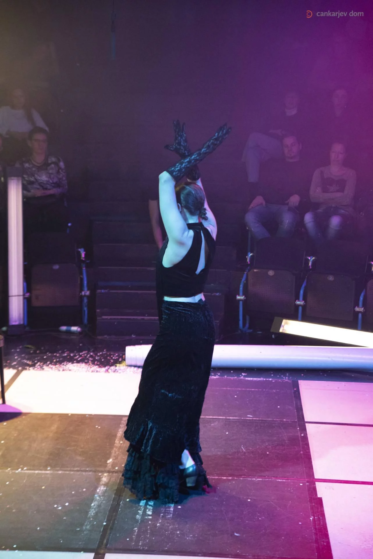 Na odru ni sama, ves čas je obkrožena s svojim glasbenim spremstvom, tudi se ji sledi v duetu s pevko, ko ena ob drugi tesno slonita, je v stiku s kitaristom in njegova kitara zajadra še v njene roke. Je temperamentna plesalka, ki ne skriva svojih ženskih strasti in čarov, ko se poigrava s svojimi lasmi ali si daje duška v kostumski ekstravaganci, tudi zakrito igra ter pleše pod velikim obodom klobuka, ki ji zakriva glavo in zakriva njen pogled (misli) pred svetom.