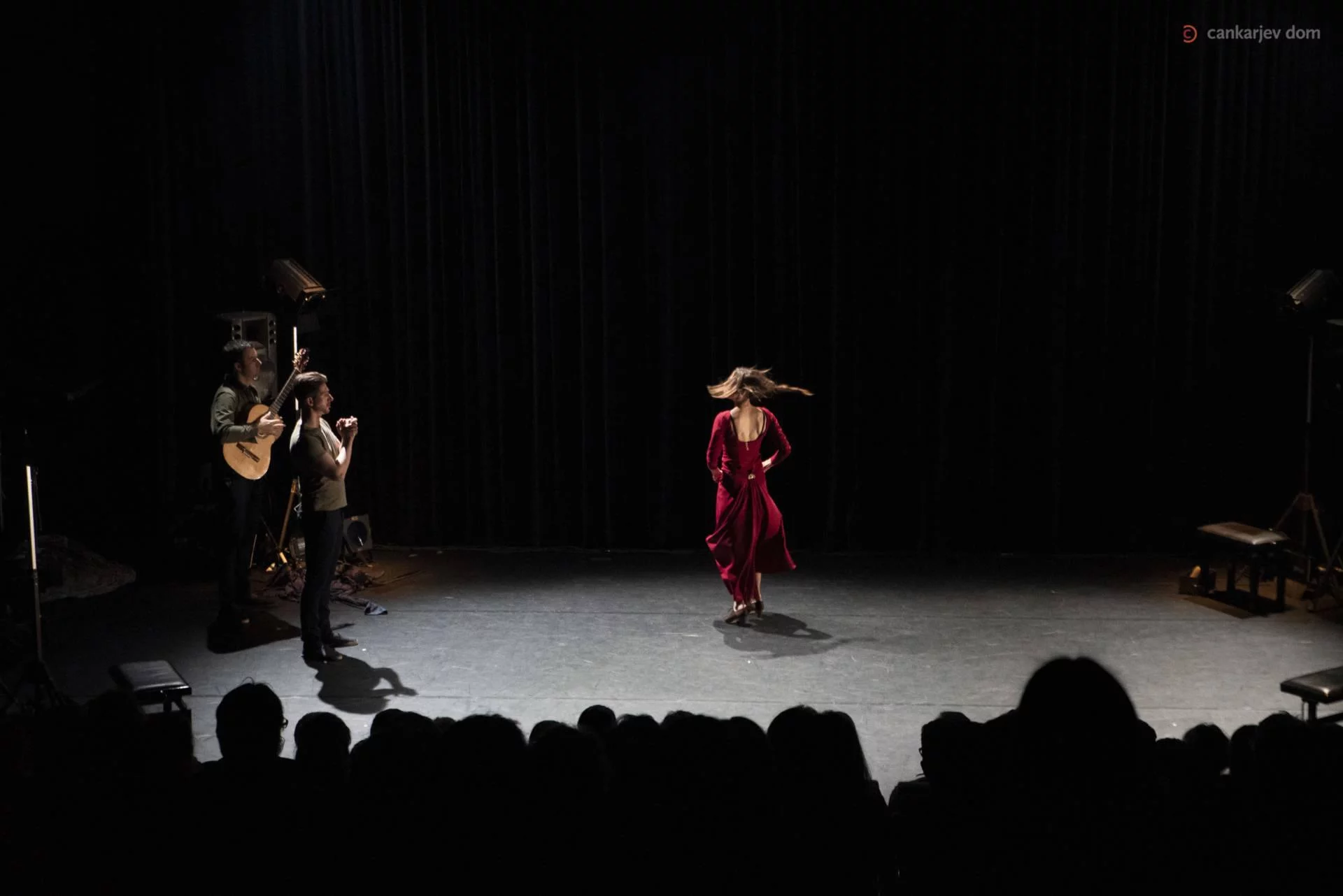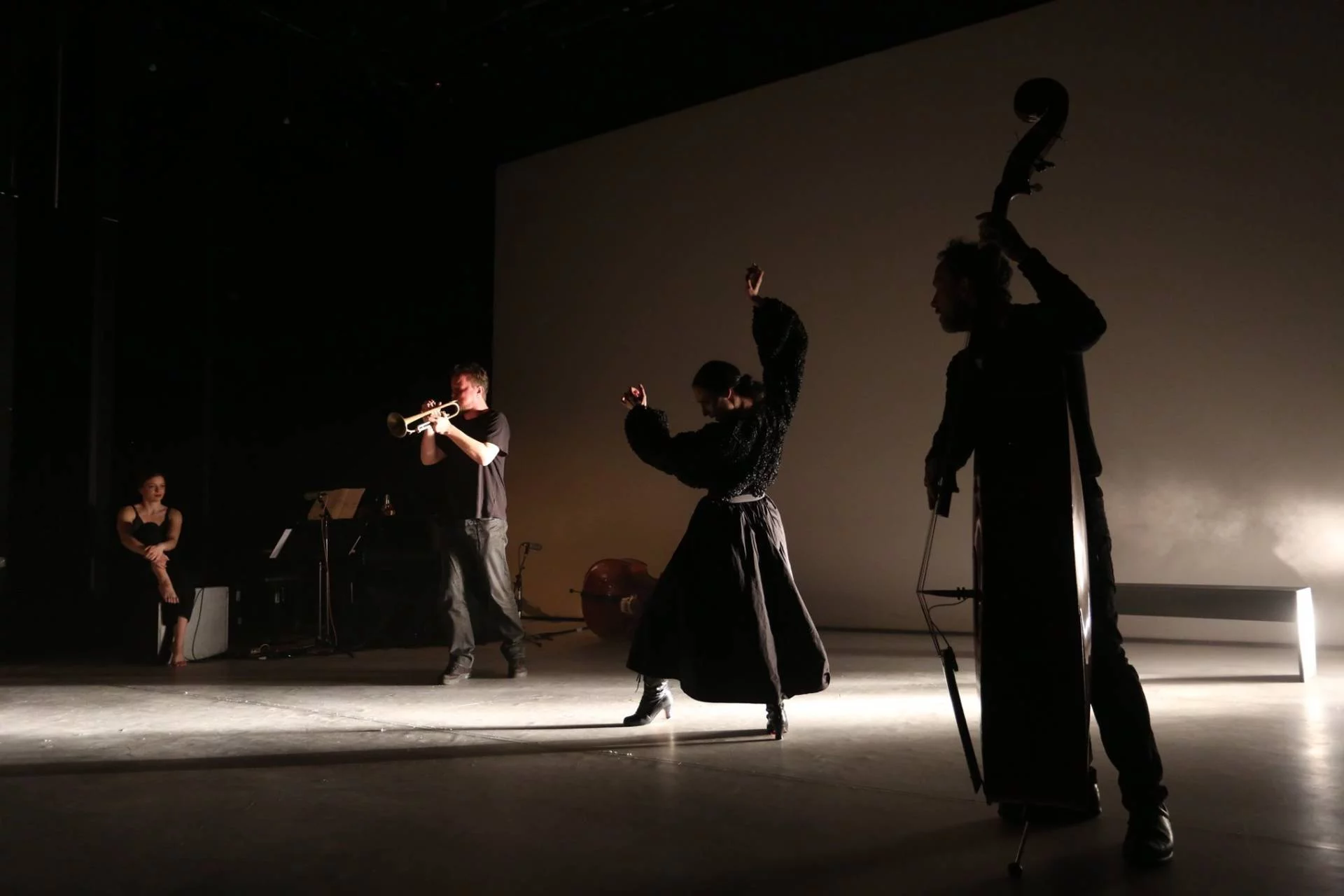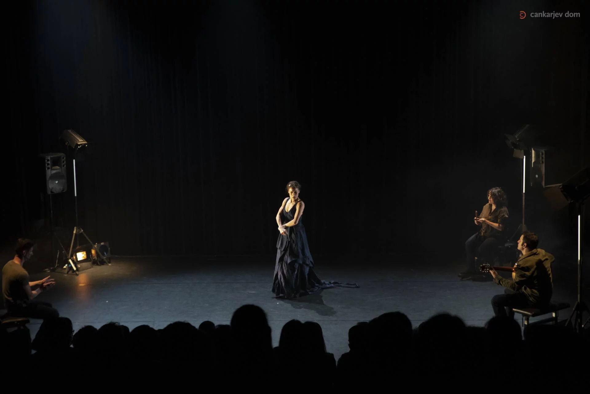 V gledališkem listu pa poetično zapišejo o njej, ženski: “Njeni koraki so skupni, njena misel je lastna neštetim in njeno krilo je polje, na katerem lahko obstaja samo skupaj z njimi. Vse dokler njenega občutka pripadnosti ne preseka slutnja individualnega in vseh njenih por ne naseli vonj svobode.” O njej v procesu igre zazveni še pesniška poetika v španščini in pisnem prevodu: “/…/ besede odidejo in ona ostane sama, govori, kliče, se prepira, šepeta, dokler je praznina ne pogoltne /…/” Gledalce ob vhodu v Kosovelovo dvorano na odru pričakajo instrumenti, tudi onidve v dolgih prepletenih krilih, zajeti v svetlobnem krogu stikoma z obrazom ob obrazu. Kar nekaj trenutkov steče, preden se začnejo rahli premiki lica ob licu, vse dokler se obraza ne razkrijeta in telesi ne vzvalovita. Onidve pa kot dve sfingi zreta v daljavo, vsaka na svojem koncu razpete tkanine, ki ju povezuje in se izvije iz njunih navideznih kril. Razideta se, čeprav so njune povezave vseskozi prisotne v umetniških plesnih oblikah, v objemu z glasbeno scensko noto, tudi znova stikoma ob sočasnem objemanju godala, ko njune dlani zaokrožijo basovski fetiš. Urška Centa je izrazita plesalka gibalne estetike, njen flamenko pa poje o močeh ženske lepote, uglašene s koraki, ritmom in eleganco plesnih rok.