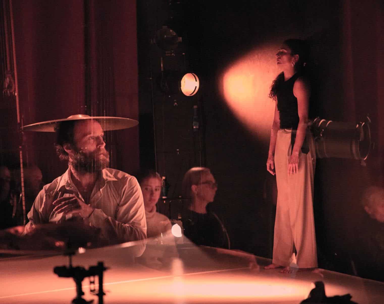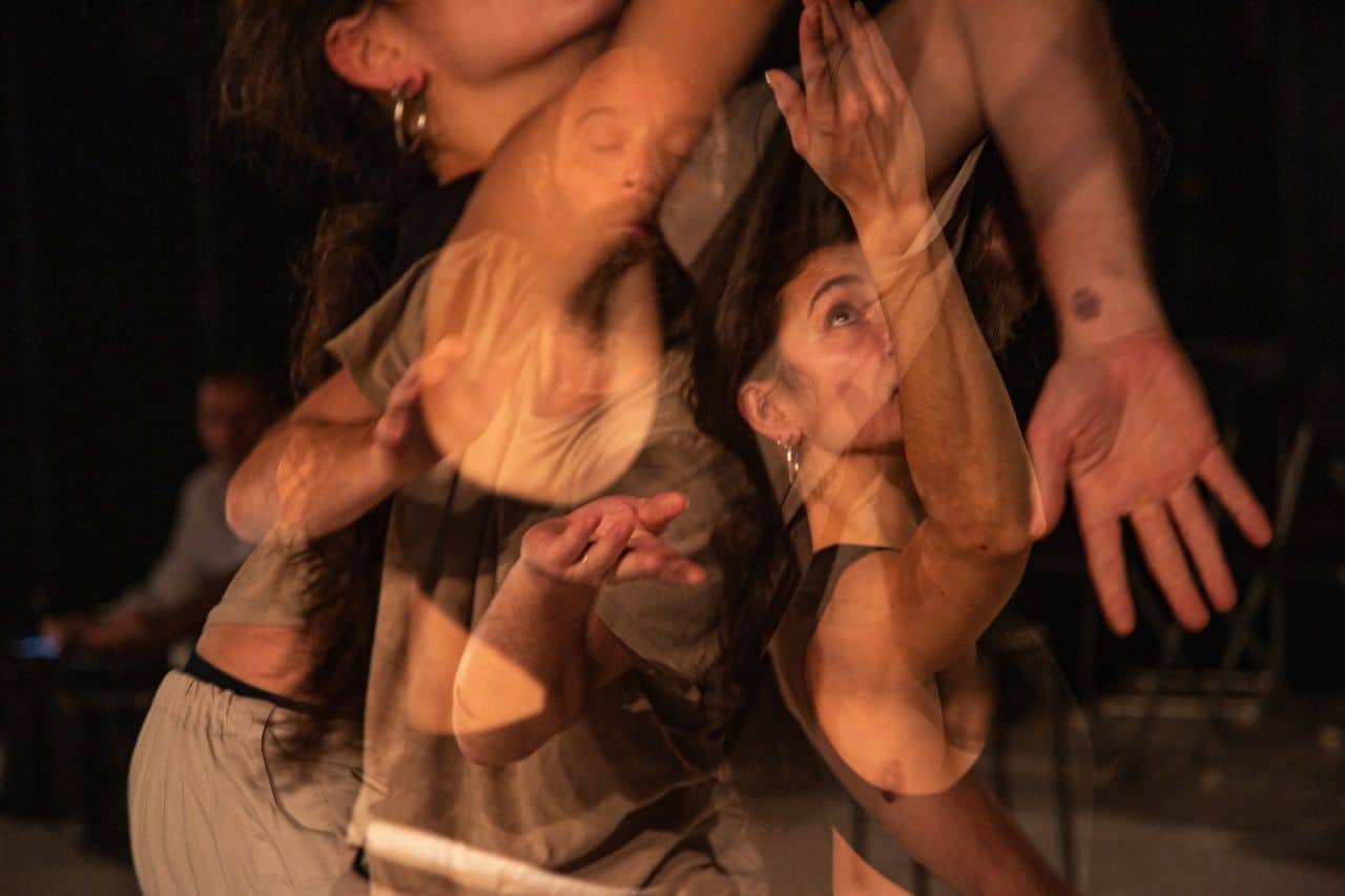 V plesni predstavi vsak od nastopajočih plete svojo gibko-tonsko čipko, ki se spleta v skupinsko prostorsko ravnovesje. Tako sledimo bosonogem glasbeniku Kristjanu Krajnčanu, ki v specifiki sodobnega plesnega teka smelo zaokroži oder, ko v nekem drugem navdihu veliko činelo veličastno vtisne na steno scene, ali se za trenutek ustavi z drugo v roki in z njo snuje svojo intimno kompozicijo tihote, predno jo prav nalahno ter navpično spusti na tla, ki zaduši njen rezki ton. Ko tudi bosonogi harfist Eduardo Raon ima s svojo ležečo harfo prav posebne tolkalne izzive. Čipkasti prostorski prepleti se tkejo posamično ali skupinsko, tudi v scenah odhodov ter prihodov, vendarle vselej v navdihu snovanja giba, zvoka, svetlobe in tišine.