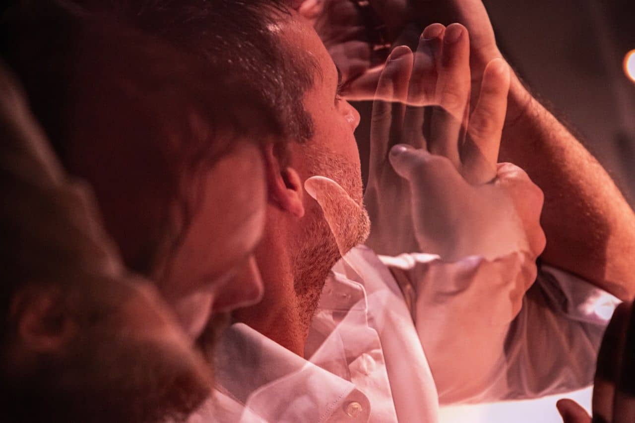 Ko luči presevajo oder, se zazna bas, baterija, prvi pa v to prostorsko intimo luči ter tišine obkroženo z gledalci vstopi Gregor Luštek, elegantno ter premišljeno v svojem sproščenem vendar dorečenem gibanju, ko roke zaokrožijo oblike, vzorce, in zadonijo toni. Malo zatem se v prostoru glasbe in plesa znajde še plesalka Krýstina Peldova, ki s svojo plesno uverturo privabi plesalca, da v spontanem objemu dueta poustvarita zgoščenko gibkih oblik. Nato, osvobojena primeža dueta, se prepustita osvobodilnem kroženju dveh teles, ki se povezujeta in združujta s silami materije ter stvarstva v smislu zgodovinskih krožnic Dervišev, kar ni samo vrtenje okoli lastne osi, ampak so krožni nagibi in so spirale rok, ki zavibrirajo energetske krožne tokove, tudi se mrežijo z glasbenimi krogotoki. Kar spodbudi Kristijana Krajnčana, da s tolkali in basom ustvarja svoje doneče ritme, ki zaokrožijo prostor; ritmi pa mehki, saj se širijo po prostoru ob udarcih tolkalcev (palic) ovitih s peno, ki zaduši zvočne presežke.