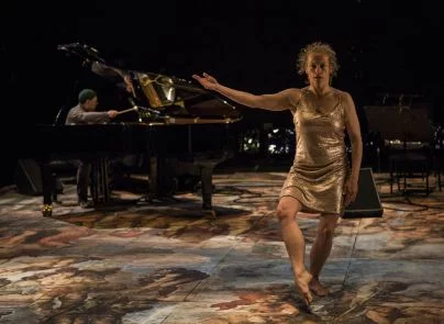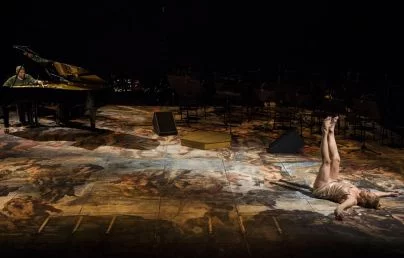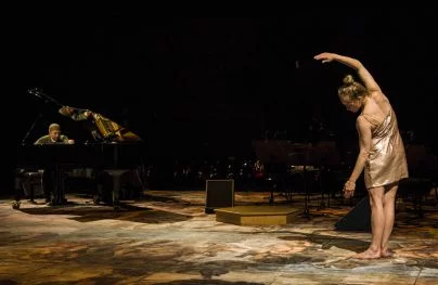 Ob vstopu v njun scenski prostor je videti v ozadju črn koncertni klavir, na drugi strani scene pa razvrščene stole z instrumenti ter notnimi stojali, ko plesna tla krasi barviti video posnetek angelskih, svetniških poslikav Michelangela Buonarrotija (1475−1564) v Sikstinski kapeli, ki je svetniškim obrazom začrtal prepoznavno človeško obliko, kot bi hotel reči tako zgoraj kot spodaj (in nasprotno), bil pa edinstveni mojster slikanja ter kipar, pač umetniški genij vseh znanih časov. Časa za ogledovanje scene je bilo kar dovolj, preden je v sceno vstopila plesalka, se tudi ulegla na svetniški talni sij ter mirno obležala, očitno v svojih poglobljenih predpripravah, ki pa so se žal tudi po nepotrebnem razvlekle; ko je po dolgi fazi mirovanja vstala, se priklonila ter odšla. Njeno uvodno dejanje je izzvenelo kot (pre)forsirana uvertura tišine pred nastopajočim performativnim koncertom instrumentalnega in gibalnega raziskovanja.