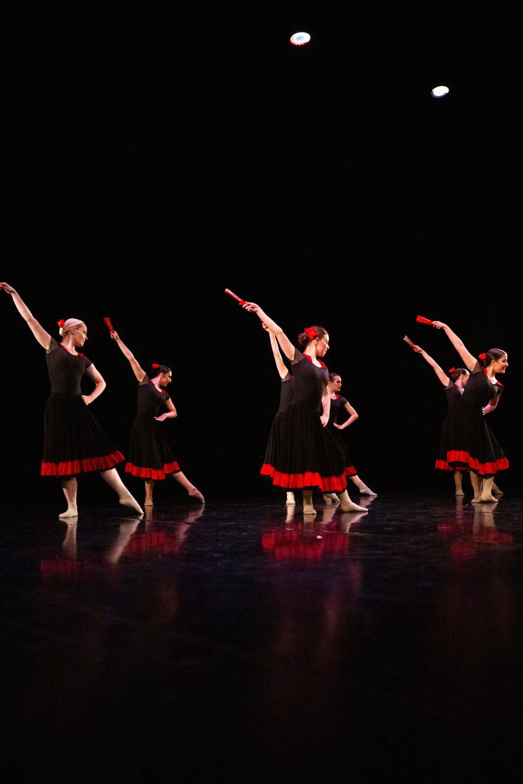 Predmet Balet I-III je znova združil študentke treh letnikov v koreografiji Tamare Divjak, ki so v skupinskem skladju zaplesale Španski ples – Balet Labodje Jezero, skladatelja Petra Iljiča Čajkovskega: Orly Manakhimov, Dunja Gavrilov, Alina Košir, Sofija Kozarić, Sara Pucihar, Irina Anatonijević in Margarita Šunjić. Temperamentni čar španskega plesa so stilno zavele v lahkih baletnih copatah, temnih oblekah širokih kril z rdečo obrobo ter s pahljačami v rokah. In je na odru zaživel plesni pridih španske Andaluzije.