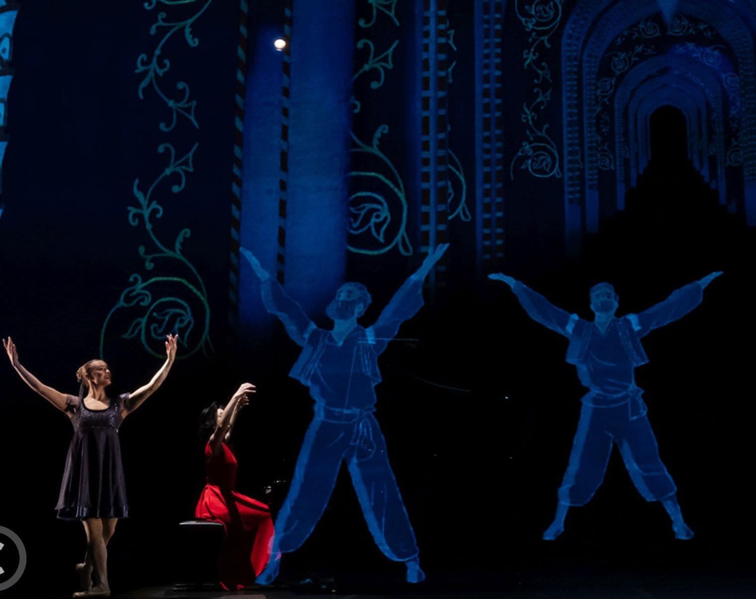 V dvorani se sreča balerino Imogen-Lily Ash, ki sprejema junake čarobne božične zgodbe o Mišjem kralju, V dvorani si sledi osupljivim plesnim digitalnim animacijam ter projekcijam na prosojni gledališki tančici. Ti digitalni, prosojni junaki nenehno obletavajo balerino, z njo zaplešejo , ali jo pač preletavajo, in so njihovi preleti baletnih korakov prav natančni, enako pozicije, medtem ko so roke bolj zračne. In se digitalni ples čarobno preliva po odru ob zvokih glasbe; ko se v piruetah zavrtijo svetlikajoče se krožnice, in izvajalci nevidno izginejo.