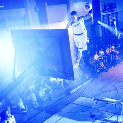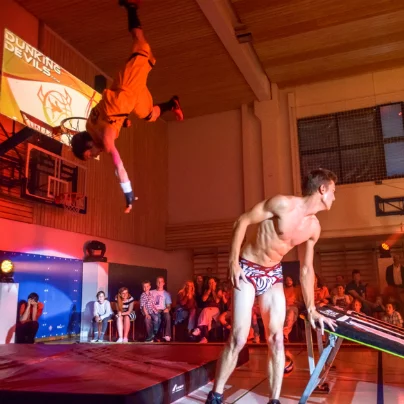 Dunking Devils, skupina drznih športnikov, ki živijo svoje sanje, je 25. maja 2014 priredila atraktivni šov v veliki in nabito polni telovadnici Gimnazije Bežigrad. To je bil njihov premierni devetdesetminutni program atletskih, akrobatskih in cirkuških spretnosti, popopran z domačim rapom in duhovitimi komentarji moderatorja, sicer diplomiranega teologa, znanega reperja, novinarja in popotnika Roka Terkaja, ki je prepoznaven pod umetniškim imenom Trkaj, slovenski reper, tudi ljubitelja hiphopa, ki je izdal že svoj album z naslovom V času enega diha. Nagajivo in sproti pa stresal zabavne komentarje, tudi poučil, kaj pomeni kratica DIF (nekoč imenovana Fakulteta za šport), no, če kdo ne ve, je to Društvo individualnih frajerjev. …