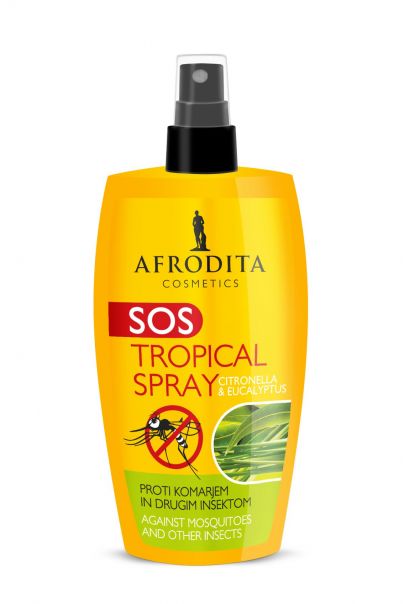 SOS TROPICAL PRŠILO z eteričnimi olji citronele, limonske trave, evkaliptusa, lavande in rožmarina odganja komarje in druge insekte, hkrati pa kožo osveži, vitalizira in prijetno odišavi. Cena za 120 ml je 5,00 eur. …
