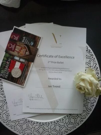 Največji mi pa pomeni to, da sva bila s soplesalko Assijo povabljena na gala koncert v Münchnu, kjer naj bi konec aprila izvedla Radio and Juliet in nastopala z znanimi plesalci z vsega sveta. Po mojem mnenju balet sicer ni tekma, je pa tekmovanje nabiranje novih izkušenj, in danes že skoraj nuja, če želiš nekoč uspeti in doseči svoje sanje. (je baletni plesalec Jan Trninič s Konservatorija za glasbo in balet Maribor komentiral za naš portal svojo udeležbo na mednarodnem tekmovanju Vibe na Dunaju. Jan je dosegel odlično drugo mesto v kategoriji profesionalcev ‘junior II’. Janu čestitke in naj nas razvaja še naprej z vedno odličnimi uvrstitvami, ki mu bodo gotovo odprle vrata v svetovni baletni svet.)