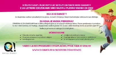 Predstavljamo vam tudi najnovejšo plesno vadbo v Sloveniji Q-dance, ki smo jo z 20-letnimi izkušnjami razvili za vas. Obnorela je vse mlade po srcu, ki uživate v ritmih plesa in fizični aktivnosti hkrati.