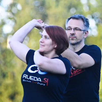 Ida: Salso sva začela poučevati leta 2006. Na začetku je vse potekalo prostovoljno. Ljudje so se ob četrtkih dobivali in preplesavali, se učili salso, so plesali, se družili, prihajali so tisti, ki jim je to všeč. In krog, rueda ima svojo moč. Ko se eden nasmehe, se drugi, podere se kot domine. Midva sva to počela brezplačno, stvari so bile organizirane v sklopu Društva salsa Slovenije, to društvo še obstaja. To niso bili razpisani tečaji, ampak je šlo za razvedrilo, druženje, prihajali so kolegi. Pozneje pa je prišlo le do pogovora, da bi naredili eno resno skupino, tečaj, ki bi bil plačljiv. In sva potem rekla, da bomo organizirali tečaj, in tisti, ki bodo hoteli, bodo prišli. To še ni bila šola, ampak tečaj, z natančno določenim terminom. Pot je tako nanesla, da sva šla na svoje, vendar še nisva imela plesne šole. So pa začeli na naju spet pritiskati interesenti – to se nama že od nekdaj dogaja – , da zakaj nimava kakšne skupine, kako se imenujemo, tako da je vse nastalo spontano, velikokrat se je govorilo Boštjanova rueda. In tako je nastala rueda.si; rueda wiki, ki mora biti ime, povezano preko spletne strani, in je nastala rueda.si. Plesali bi radi. Ta plesna šola ni imela sestanka, kjer bi se zmenili, da bomo imeli šolo in kako se bo imenovala. Vse je nastalo zelo spontano. Vse se je tako sestavilo. Poslanstvo prenašanja znanja naprej. 24/7, ves čas deluje. Ves čas, stalno, na nek način iz tega razloga, ker želiš obdržati kakovost pri tehniki, red, da prideš do dobrih rezultatov. Danes je malo takih ljudi in take ljudi s takšnim razmišljanjem tudi iščemo. Mesec, dva, sestaviti skupino, ki jo peljemo več let zaradi tega, da se lahko naredi razvoj, v dveh mesecih človek ugotovi, ali mu je stvar sploh všeč ali ne. Nedelje so ‘top’ plesni dan, takrat se dogaja.