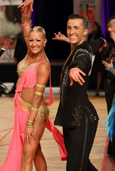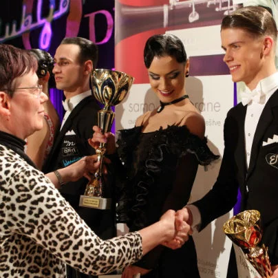 Ob plesišču lično urejene dvorane smo opazili tudi nekaj znanih obrazov, ki so zavzeto spremljali tekmovanje vrhunskih plesalcev. "Vedno sem občudovala plesalce in ko se mi je pred leti ponudila priložnost, da s profesionalcem zaplešem v eni od priljubljenih zabavnih oddaj na televiziji, sem jo zgrabila z obema rokama. Ko sem izkusila koliko dela je potrebno vložiti v nekaj minutni nastop se je moje spoštovanje do te športne zvrsti le še povečalo," nam je zaupala pevka Regina, ki tudi sicer rada pleše. "Vsako priložnost za ples vedno izkoristim, pa naj bo to na kakšni dobri zabavi ali pa kar v domači dnevni sobi, če na radiu zaslišim dobro pesem," je še dodala. In če so Regino navduševale spretnosti, je brez sape med nastopi zaradi čudovitih kreacij ostajala modna blogerka in novinarka Saša Bernetič: "Vidi se, da je v vsako obleko vloženo ogromno časa, dela in ročnih spretnosti. Vsi ti kristalčki so eden po eden lepljeni ali pa šivani na glamurozne obleke, na določenih jih je tudi po več tisoč." Na svoj račun je prišel tudi glasbeni producent in mednarodni "hitmejker" z več kot milijon prodanih plošč po celem svetu Josip Miani – Pipi. "Tudi če mi glasba in ples ne bi bila pri srcu, bi užival že ob pogledu na vsa čudovita dolgonoga dekleta, ki tako zelo spretno obvladajo svoja telesa. Vidi se, da vrhunski pari posvečajo vsak trenutek plesu in ničesar ne prepuščajo naključju. Izjemna muzikaličnost in ritmičnost nekaterih plesalcev me je dejansko pustila brez besed," je po tekmi hitel razlagati Pipi. Jakob Kapus in pevka Regina. (Foto: Marko Mesec)