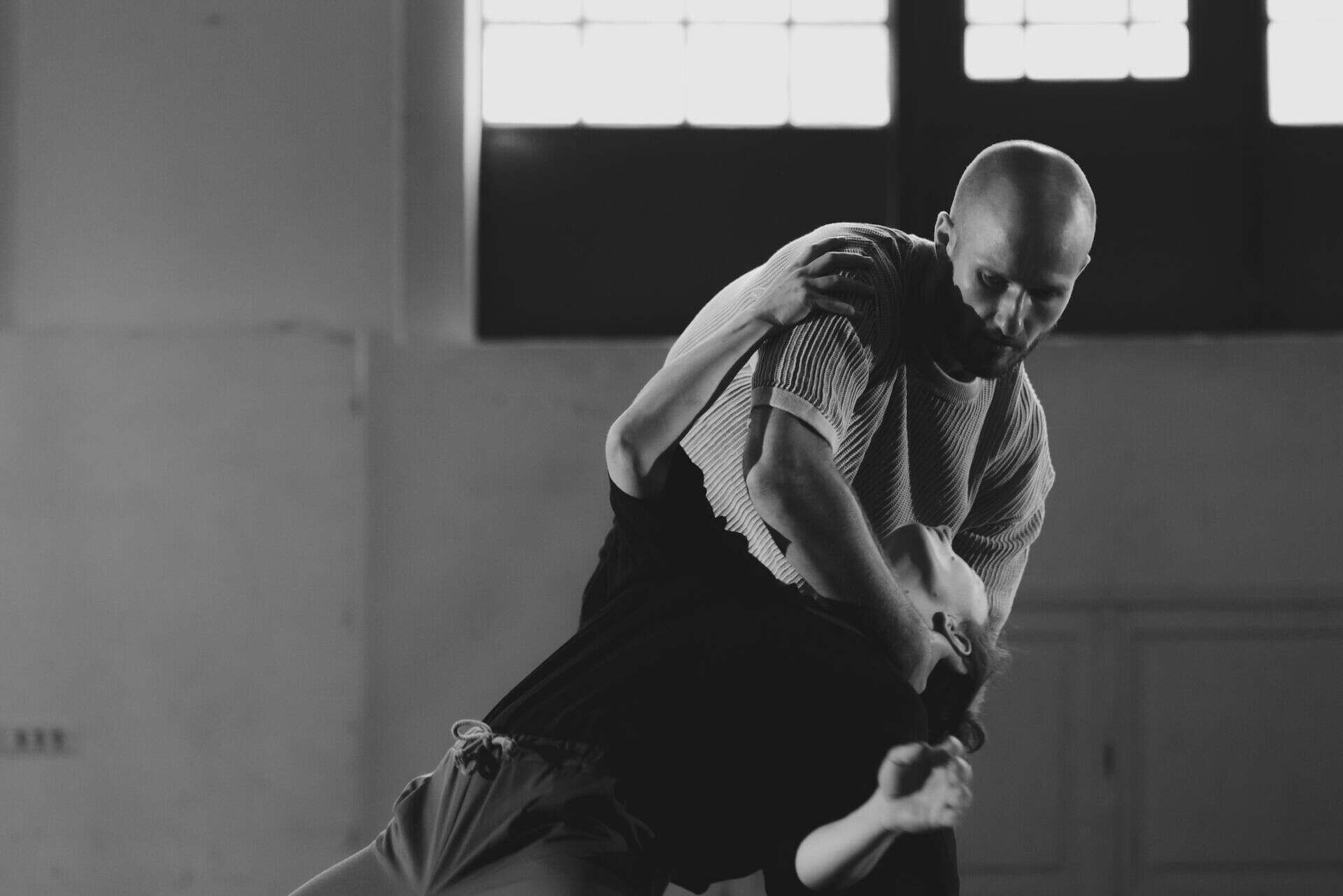 Prvi del predstave postavi občinstvo v vlogo voajerjev. Skozi okno v sosednjem prostoru opazujemo izjemno plesalko Jerco Rožnik Novak. Z geometrijskimi gibi meri različne razdalje v prostoru in tako umešča svoje telo v scenografijo sobe. Ob spremljavi klasične glasbe premika dva stola, se pozicionira v odnosu do stene, išče njene robove. Prizor po eni strani spominja na gledališko atmosfero predstav Pine Bausch, po drugi strani pa sledi geometrijskim likom, minimalizmu in funkcionalnosti avantgardne šole Bauhaus. Njen ples opazujemo od zunaj in je ne vidimo zares dobro, po eni strani je to za gledalce vir frustracije, ki pa je nameren in se z nadaljevanjem predstave celo stopnjuje. Jerci se v drugem prostoru, med gledalci, pridruži plesalec Beno Novak. Tudi njegovega plesa ne ujamemo v celoti, saj nam uhaja, včasih ga le slišimo, potem stoji čisto blizu, nato nas preseneti na drugi strani stekla. Postopoma skupaj z njim vstopimo v preddverje dvorane. Jerci in Benu se pridruži še plesalec Davide Lafabiana. Z repetitivnimi in natančnimi, minimalističnimi koreografijami premerijo prostor. Skupaj z njimi ga tudi mi, ki smo se kot skupina tukaj znašli, in merimo tudi čas. Z odgovori publike in našo postavitvijo v prostoru nastopajoči označijo meje in čas dogodka. Skupaj torej tvorimo okvir, v katerem se nahajamo. Čeprav plesalci zaradi svoje neomajne potrebe bo gibu in premikanju našim očem ves čas uhajajo.