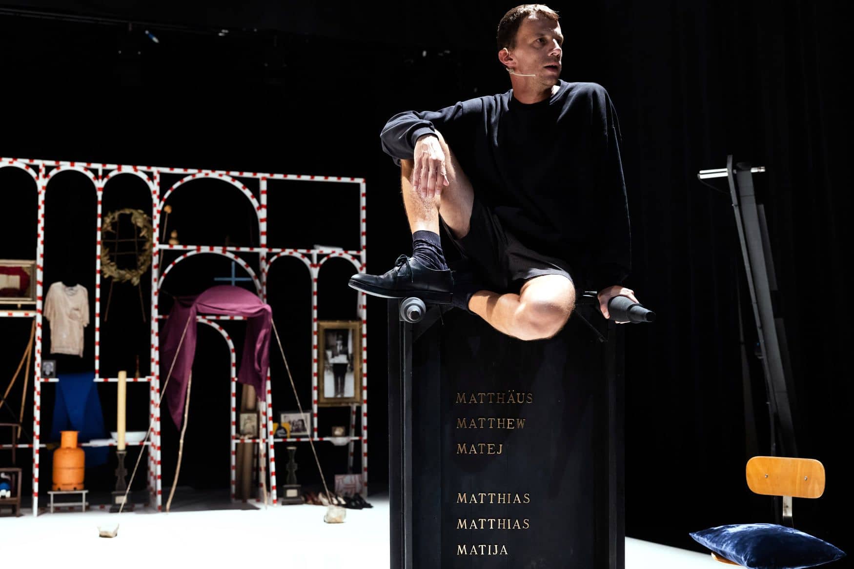 Prvi del performativnih povezav glasbe, besedila in sila natančne poslikave življenjske minljivosti starčka se v toliki meri fluidno pretaka, da se čas izgublja v miselnih globinah, tudi se brišejo meje med iluzijo in stvarnostjo. Tik pred odmorom pa starček pridobi mladostno preobrazbo, tudi športno preobleko (kostumografija: Desa Janković, Matija Ferlin). Ko iz starčeve preobleke izstopi mladenič Ferlin s svojimi znamenitimi, večkrat uporabljenimi malimi živalskimi podobami in poimensko oznanja rodovnik po Mateju. Drugi del že na začetku zablesti v svetlobnem in barvitem scenskem blišču mnogih predmetov in kostumskih oblik (oblikovanje svetlobe, vodja tehnike: Saša Fistrić). Nato pa sledil koreografov gibko zasnovan, celo pikro niansiran sodobni prevod izbranih in oštevilčenih pripovedi Pasijona po Mateju; ko se je našel gledalec v avditoriju, ki je sočasno preverjal izvirni tekst in sledil dogajanju na odru.