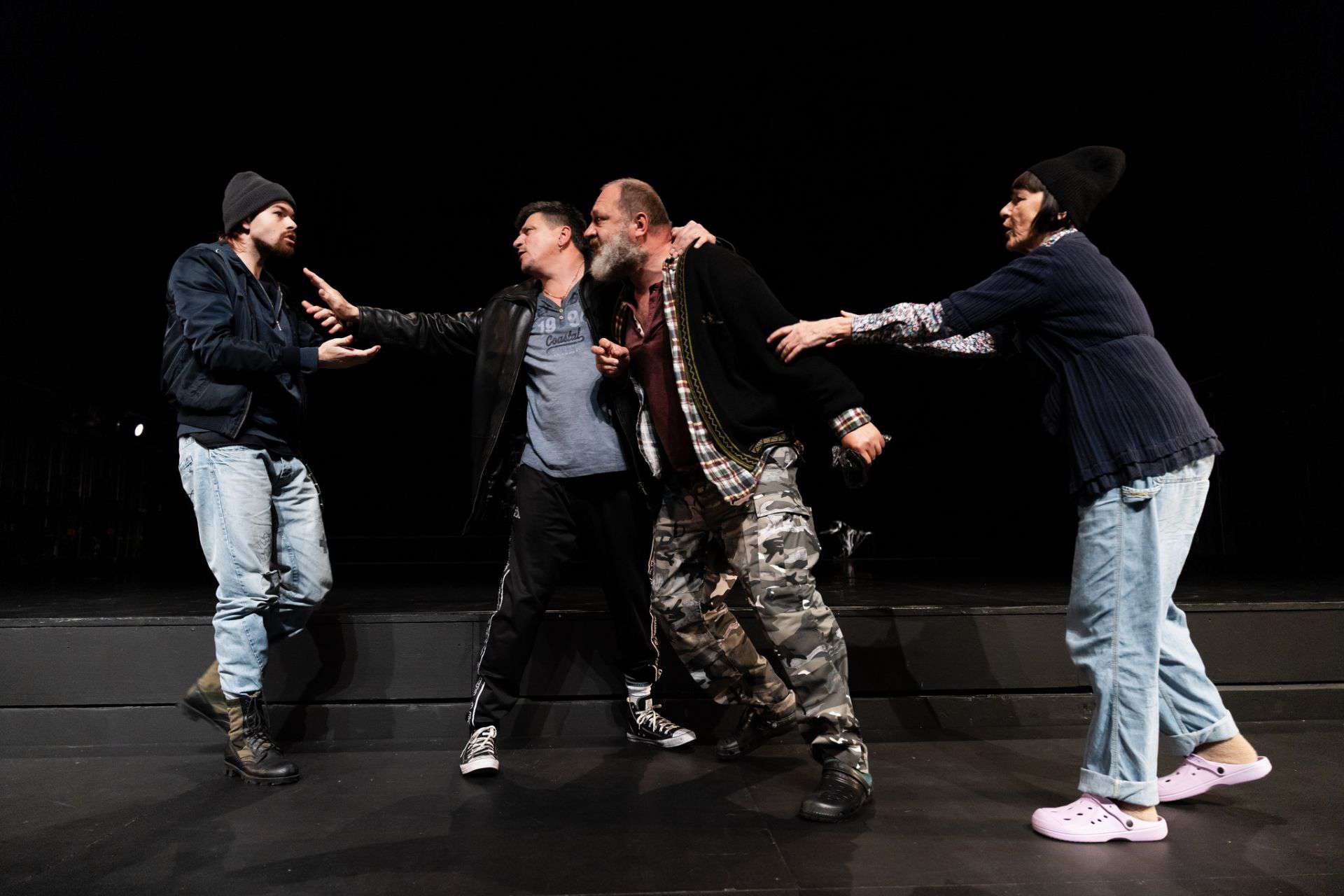 Luči v dvorani se niso niti utrnile, ko se je z zgornjem parterju zaslišal odmevni prepir, dveh ljudi in je tudi skupina kaj kmalu priletela na oder, kjer se pričel filmsko insceniran pretep. Po oblekah ter starosti sodeč je bil to fizični prepir med brezdomci, ko so se nekateri pretepali, drugi pa so jih mirili. Strasti so se čez nekaj časa tudi umirile. Kot da prepira ni bilo, kar je značilno za njihov način druženja. Posedli so se na desno polovico odra ter pričeli pripovedovati svoje intimne zgodbe.